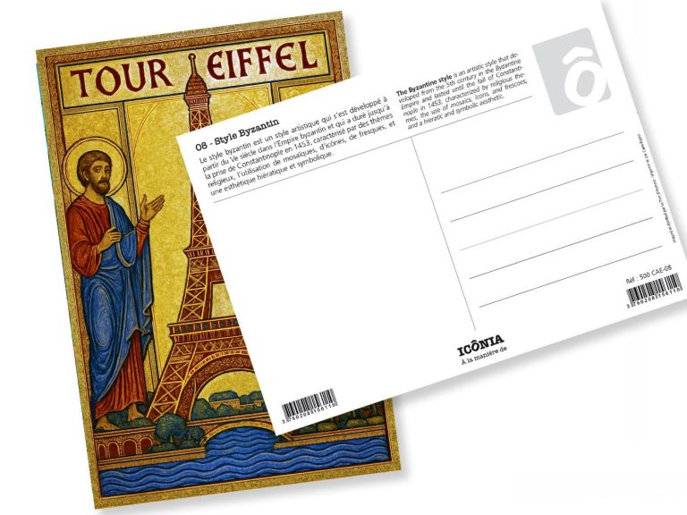ainsi qu'une explication en français et en anglais du thème de la carte postale (exemple : "Le mouvement Bauhaus").