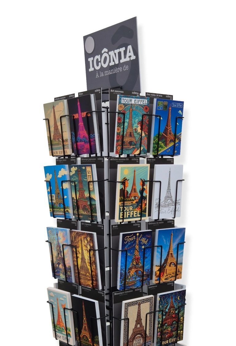 Les cartes postales sont vendues dans un présentoir avec intercalaires thématiques.